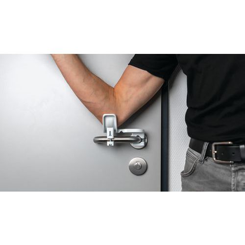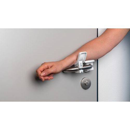 Importante: não instalar em portas cortafogo (normas DIN 18273 e EN 1634) e saídas de emergência (normas EN 179 e EN 16034). Material ABS ignífugo adequado para edifícios públicos (segundo a norma DIN 4102-1), resistente a produtos de limpeza e desinfeção e sem qualquer deterioração. Para fixação nos puxadores existentes sem risco de os danificar.
