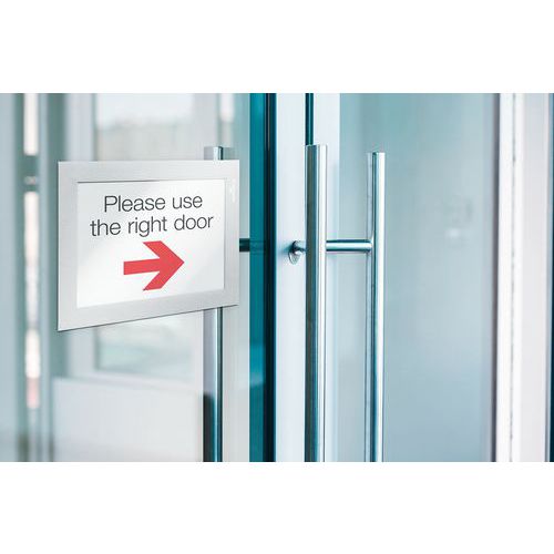 Quadro de exposição adesivo Duraframe® para superfícies lisas. Graças ao verso autocolante reposicionável, a estrutura cola e descola em qualquer superfície lisa e rígida, como paredes, portas, etc. Legibilidade em ambos os lados do documento numa superfície envidraçada. Atualização rápida e fácil, fixação dos documentos graças à estrutura magnética. Utilização na vertical ou horizontal. Solução ideal para afixar informações gerais e obrigatórias da empresa, promoções, regulamentos internos, notas informativas, etc.