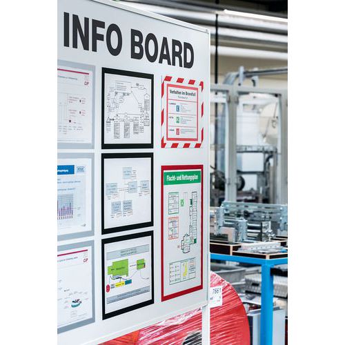 Quadro para exposição de documentos (notas de informação, regulamentos, horários, instruções de segurança, etc.). Fixa-se a superfícies metálicas (portas, quadros brancos, blocos de compartimentos, etc.). Atualização rápida e fácil de documentos: a estrutura magnética facilita a inserção dos documentos pela lateral e a manutenção perfeita no respetivo lugar. O quadro é reposicionável de acordo com as suas necessidades. Mude facilmente o que está exposto. Utilizado na vertical ou horizontal. Mude facilmente o que está exposto. Utilizado na vertical ou horizontal. Fabricado na UE Garantia do cliente : 2 anos