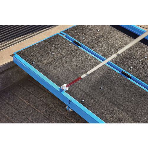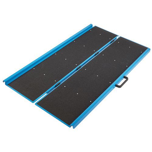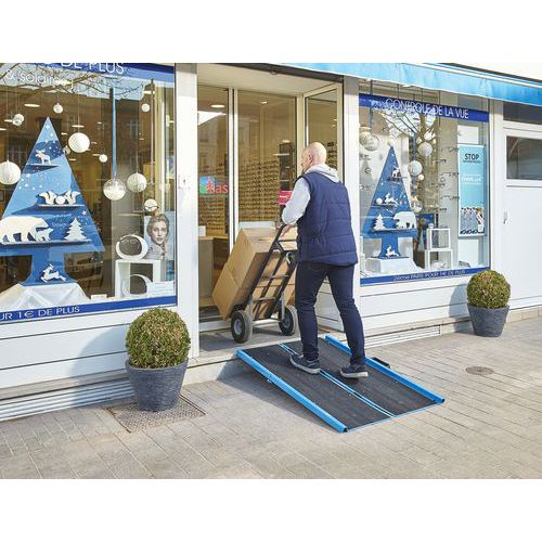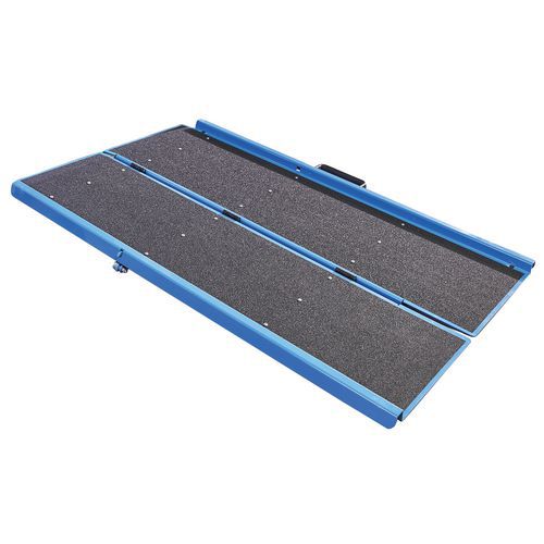Rampa de acesso para carros, tapetes rolantes, etc. Prática de arrumar, a rampa pode-se dobrar em dois. Equipada com um revestimento antiderrapante. Fabricado na UE
