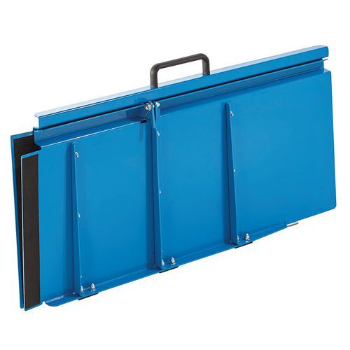 Rampa de acesso para carros, tapetes rolantes, etc. Prática de arrumar, a rampa pode-se dobrar em dois. Equipada com um revestimento antiderrapante.