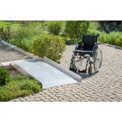 Rampa de acesso para PMR adequada para degraus altos com uma capacidade de carga de 400 kg. Superfície de rolamento com perfuração especial para uma segurança antiderrapante ideal. Rebordos de proteção disponíveis para maior segurança. Produto pronto a utilizar e fácil de transportar. Conceção robusta para uma utilização intensiva. Acessibilidade pessoas com incapacidades Garantia do cliente : 2 anos
