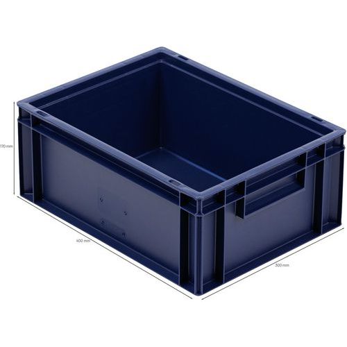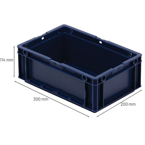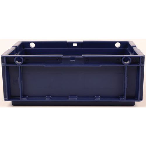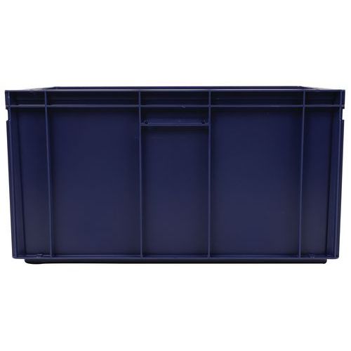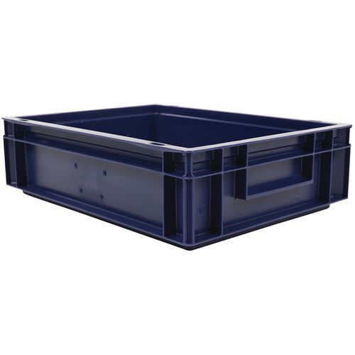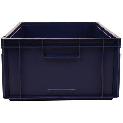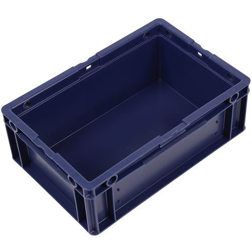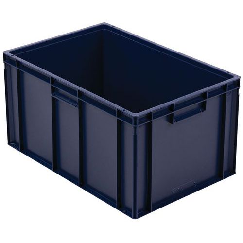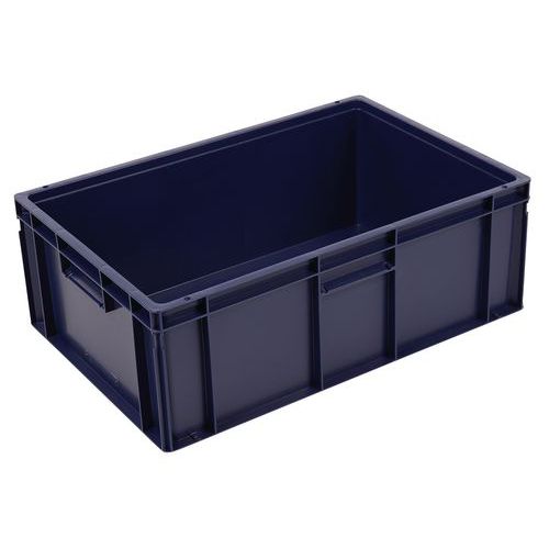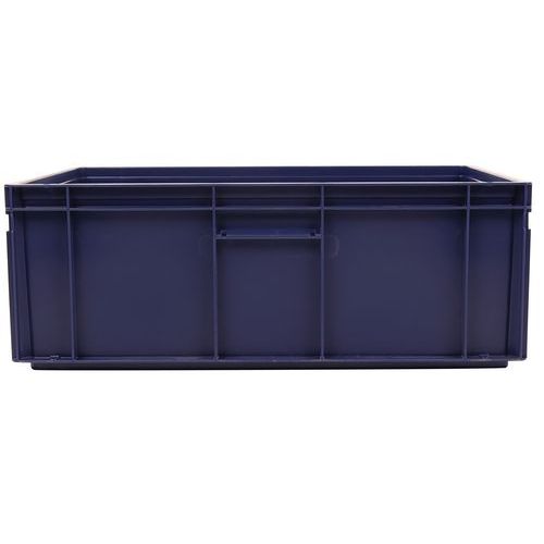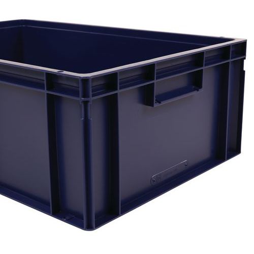 Caixa de norma europeia com grande estabilidade para empilhamento. Pegas fechadas: facilidade de movimentação, capacidade preservada. Resistência aos óleos, às gorduras e a numerosos produtos químicos.