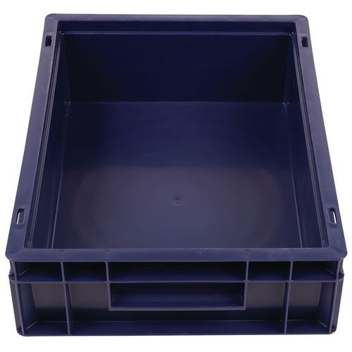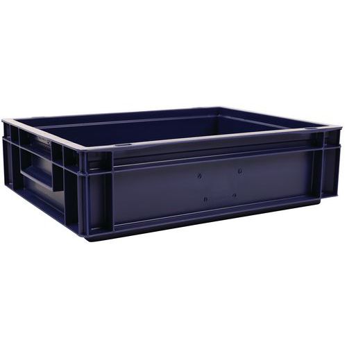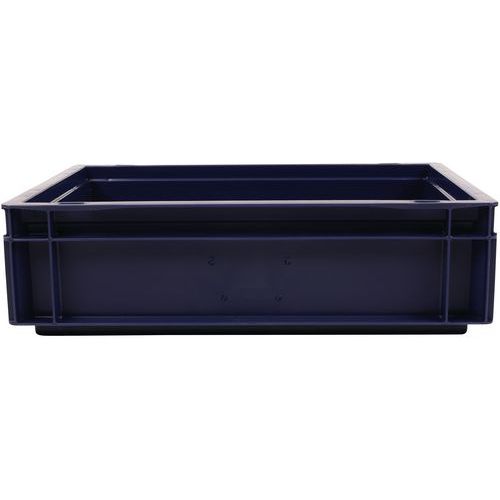 Caixa de norma europeia com grande estabilidade para empilhamento. Pegas fechadas: facilidade de movimentação, capacidade preservada. Resistência aos óleos, às gorduras e a numerosos produtos químicos.