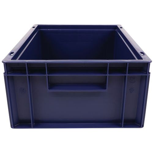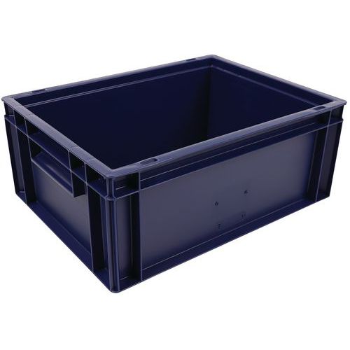 Caixa de norma europeia com grande estabilidade para empilhamento. Pegas fechadas: facilidade de movimentação, capacidade preservada. Resistência aos óleos, às gorduras e a numerosos produtos químicos.