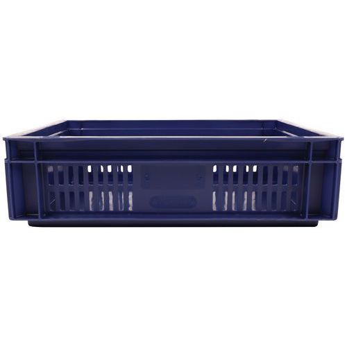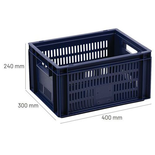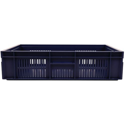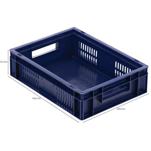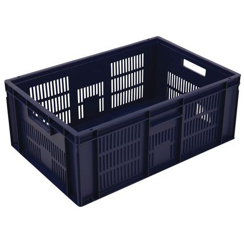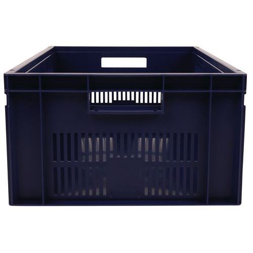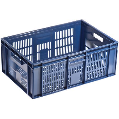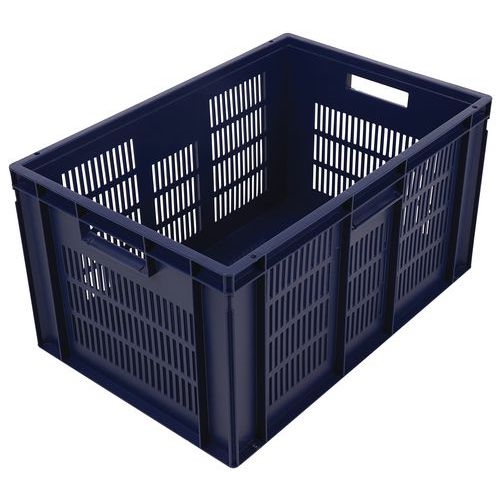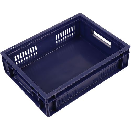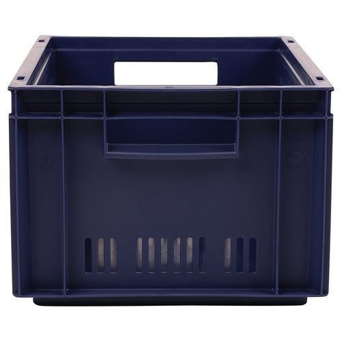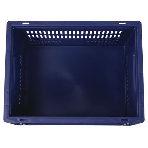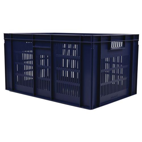 Caixa de norma europeia azul com grande estabilidade para empilhamento. Boa ventilação garantida com as paredes gradeadas. Facilidade de manuseamento graças às grandes pegas abertas. Resistência aos óleos, às gorduras e a numerosos produtos químicos.
