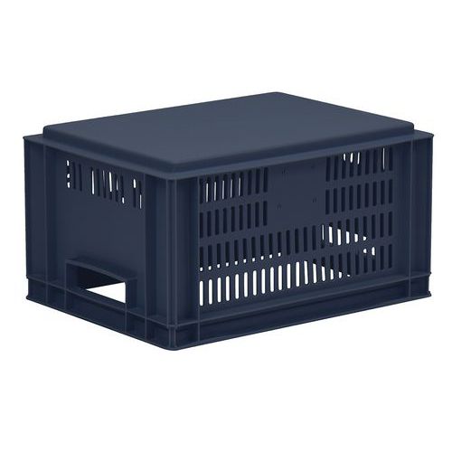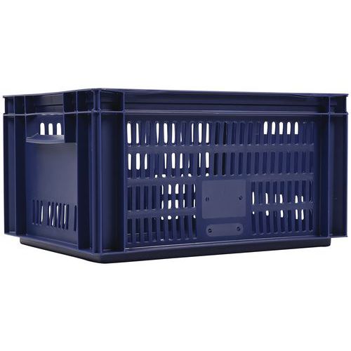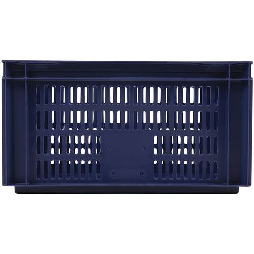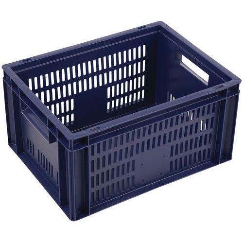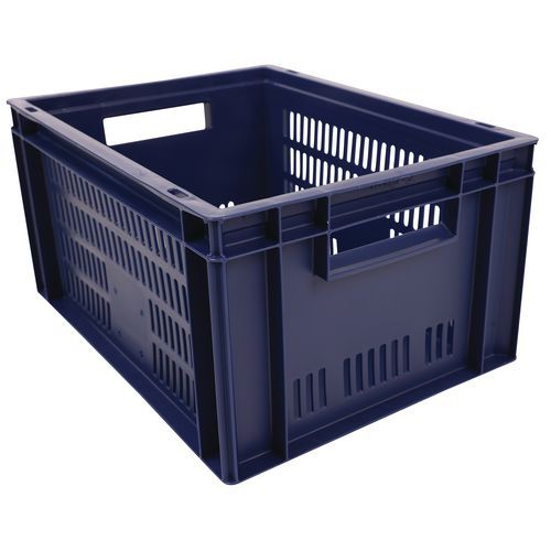 Caixa de norma europeia azul com grande estabilidade para empilhamento. Boa ventilação garantida com as paredes gradeadas. Facilidade de manuseamento graças às grandes pegas abertas. Resistência aos óleos, às gorduras e a numerosos produtos químicos.