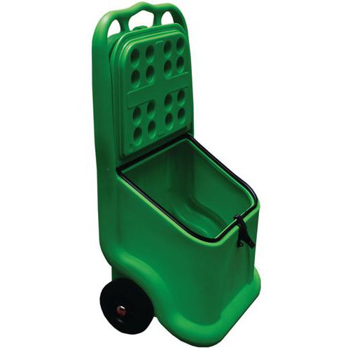Recipiente para sal ou areia em formato pequeno, móvel e em polietileno. Rodas em borracha e pegas ergonómicas. É resistente à maior parte dos produtos químicos e pode ser utilizado em espaços interiores ou exteriores. Fecho de pressão e vedação. Pegas de movimentação.