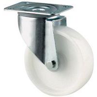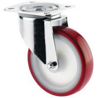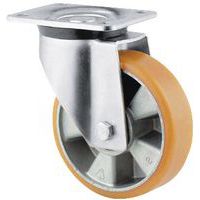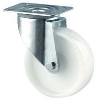 - Rodízio giratório com jante em nylon e camada de desgaste em poliuretano com garfo em aço galvanizado, resistência aos óleos e às gorduras.