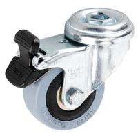 - Rodízio duplo giratório com travão e fixação com olhal, jante em material sintético.