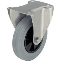 - Rodízio fixo sólido com garfo em chapa de aço soldada mecanicamente, acabamento galvanizado e cromado.