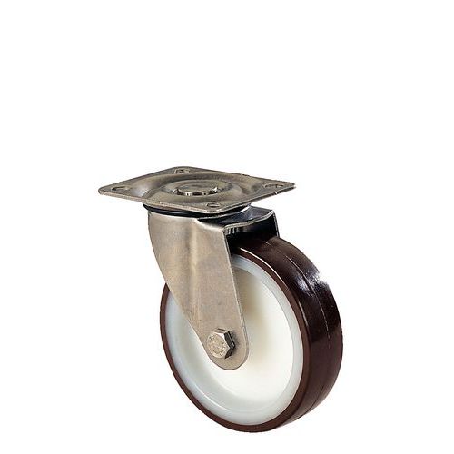 - Rodízio giratório com garfo em aço inoxidável e sistema de rotação resistente aos diversos ácidos.