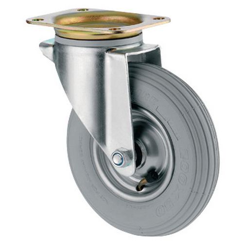 - Rodízio giratório com jante em aço, pneu insuflável em borracha e estrutura em aço zincado.