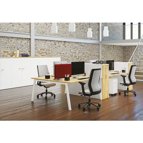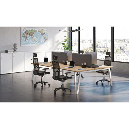 Secretária Bench ideal para trabalhar em equipa. Eletrificação: tampo com orifícios para a passagem de cabos. Painel melaminado e tampo Structurex® com cantos em ABS antichoque de 2 mm. Pés oblíquos com estrutura em arco A. Produto a complementar com a secretária Bench inicial de 2 postos Partage. Concebido para promover o trabalho flexível e o coworking. Trabalhe com total mobilidade e interaja com os colegas mais facilmente.