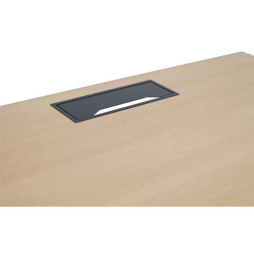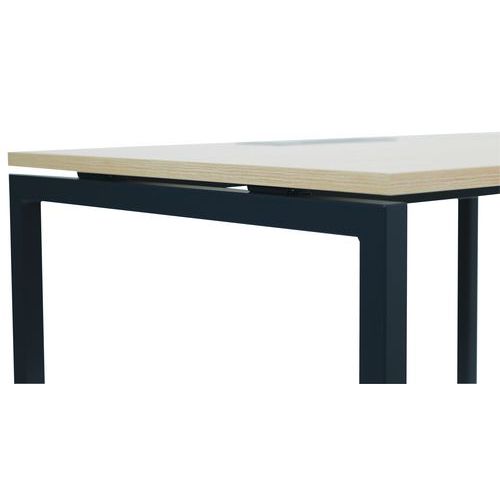 Secretária reta com tampo em melamina de 25 mm e cantos em ABS de 2 mm. 2 travessas de fixação em tubo metálico de 40 x 20 mm. Estrutura dos pés retos em metal 40 x 40 mm com pés em plástico para nivelamento. Tampo equipado com uma passagem de cabo com abertura para ajudar na gestão dos cabos.