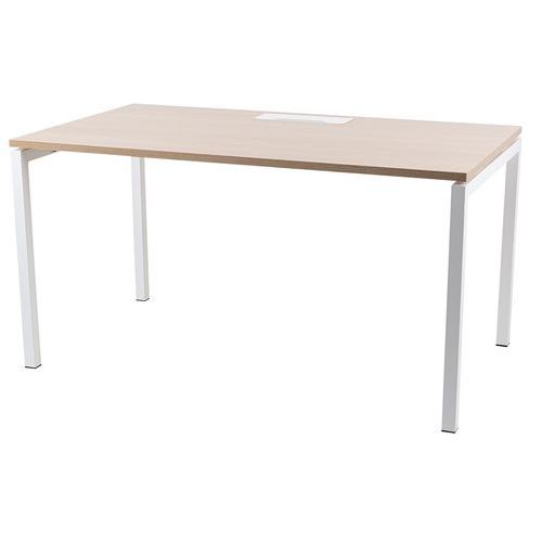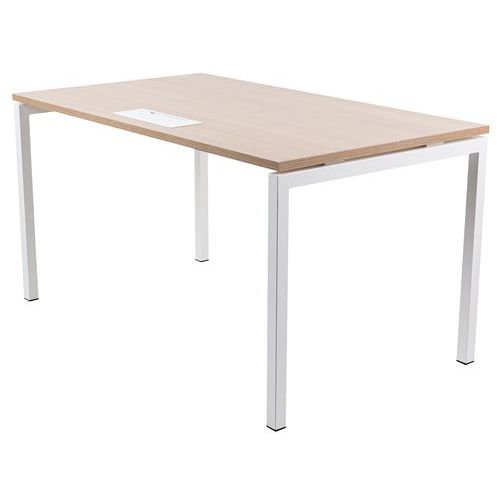 Secretária reta com tampo em melamina de 25 mm e cantos em ABS de 2 mm. 2 travessas de fixação em tubo metálico de 40 x 20 mm. Estrutura dos pés retos em metal 40 x 40 mm com pés em plástico para nivelamento. Tampo equipado com uma passagem de cabo com abertura para ajudar na gestão dos cabos.