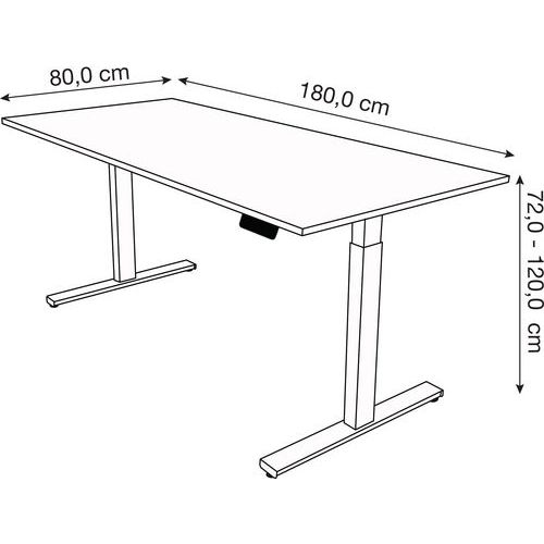 Secretária regulável em altura de 72 cm a 120 cm. Tampo com topo melaminado em ABS de 19 mm. Estrutura em aço e pé em T. Funcionalidade de memória: 4 alturas pré-registadas para uma regulação simples. Sobe a uma velocidade de 36 mm/segundo.