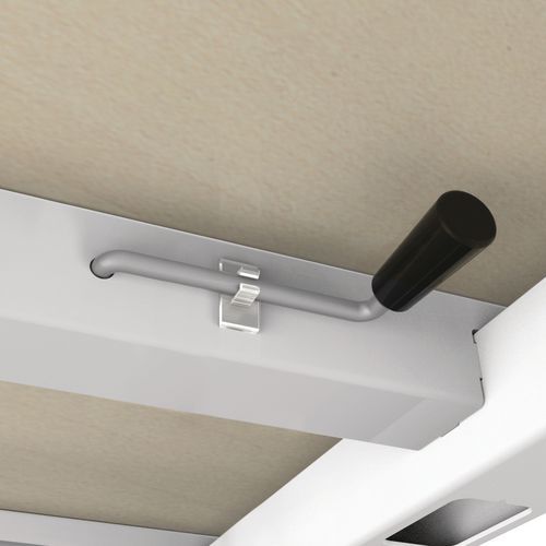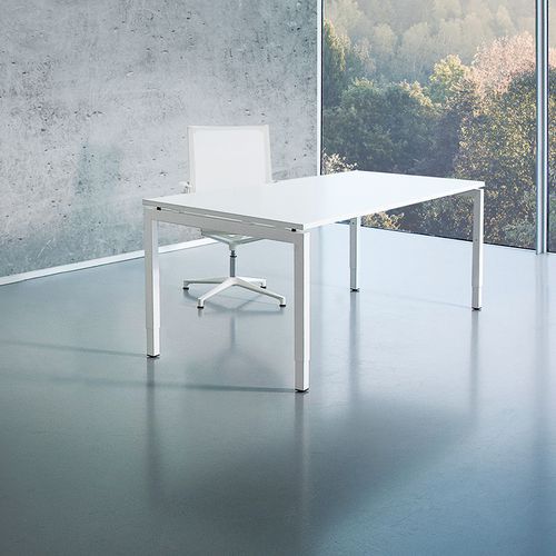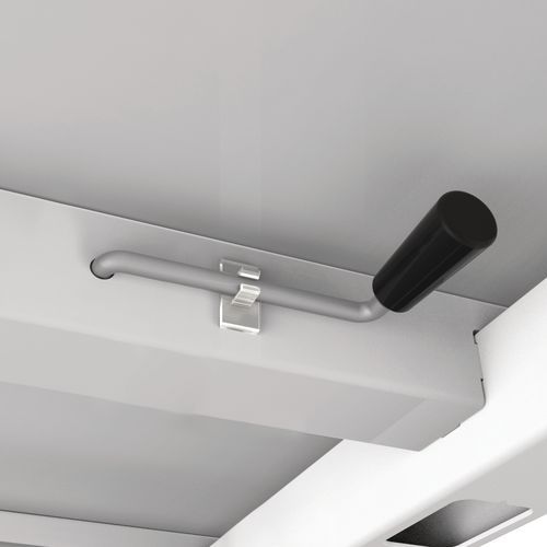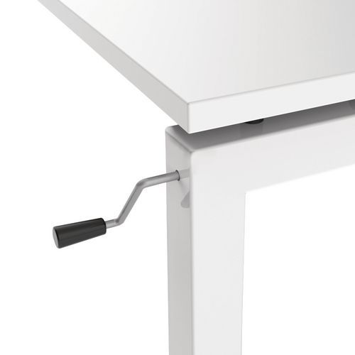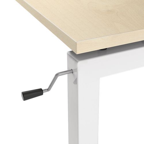 Secretária reta com base em U. Manivela de regulação para ajustar a altura da secretária. A manivela de regulação está instalada por baixo da mesa e colocada sobre a base para elevar ou descer a secretária.