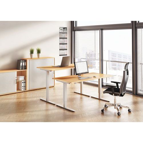 Secretária reta ergonómica graças à altura regulável +/- 5 mm por interruptor. Dois motores integrados nos pés. Manga para cabos incluída. Ideal para trabalhar protegendo contra os problemas de costas