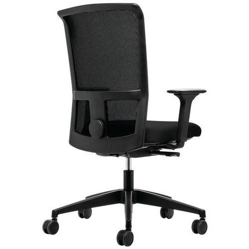 Cadeira de secretária giratória com espaldar alto forrado e bloqueável na posição dianteira e traseira. Sistema com mecanismo síncrono com regulação automática da tensão em função do peso. Apoio lombar com regulação em altura. Apoios para os braços em T 4D para aliviar a musculatura do pescoço e da nuca.