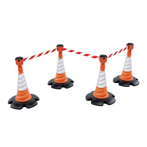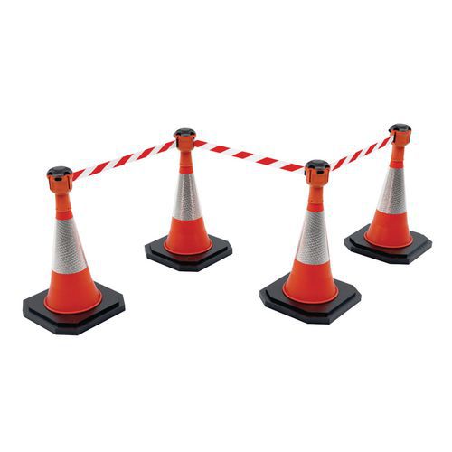 Cada unidade possui 9 metros de fita de tecido de alta qualidade totalmente retrátil, nas cores vermelho/branco ou amarelo/preto.