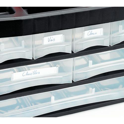 - Gavetas transparentes com um porta-etiquetas, muito prático.