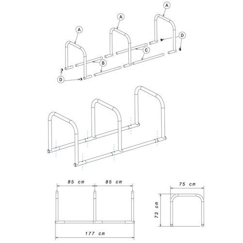 | Nome do artigo | Suporte de arco para bicicletas – 6 a 10 lugares, Comprimento total: 1770 mm, N.º de lugares: 6 |