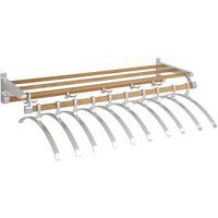 Suporte de cabides de parede em alumínio anodizado com um acabamento bonito e ganchos. Elementos estruturais, barra e ganchos resistentes e duradouros. Plataforma de arrumação com prateleira superior composta por ripas. 1 varão traseiro com ganchos, 1 varão dianteiro porta-cabides.
