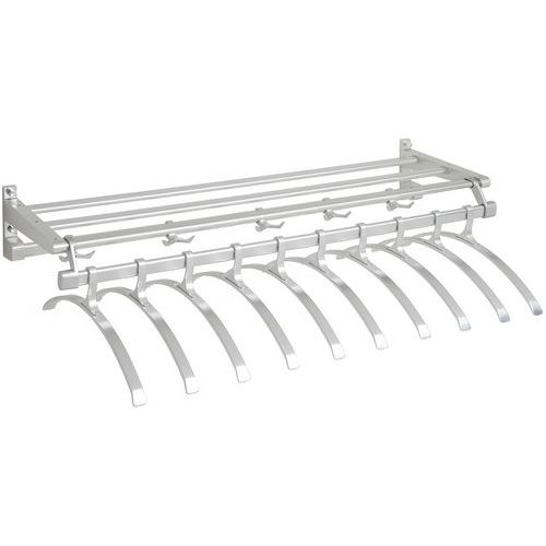 Suporte de cabides de parede em alumínio anodizado com um acabamento bonito e ganchos. Elementos estruturais, barra e ganchos resistentes e duradouros. Plataforma de arrumação com prateleira superior composta por ripas. 1 varão traseiro com ganchos, 1 varão dianteiro porta-cabides.