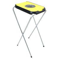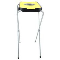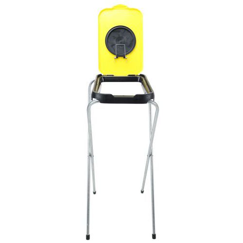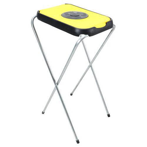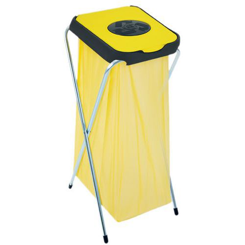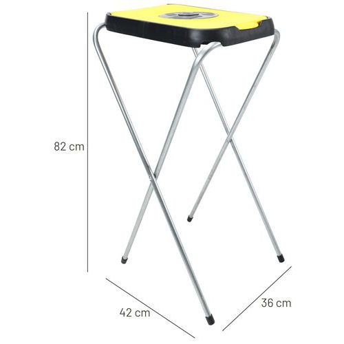 Suporte de saco com estrutura dobrável em aço galvanizado com tampa de plástico colorida.