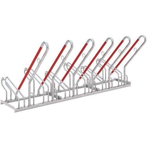 Suporte para bicicletas moderno. Robusto e estável. Anticorrosão graças à galvanização. Espaços de 350 cm entre as rodas. Compatível com BTT com largura de pneu de 55 mm. Fácil instalação e manutenção. Possibilidade de fixação ao solo.