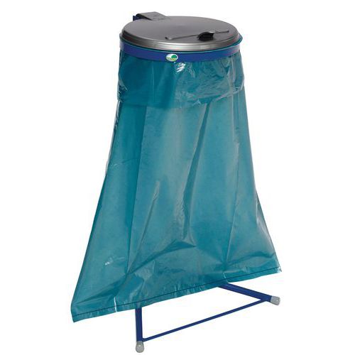 Suporte para saco de lixo com tampa de plástico. Cor da tampa à escolha segundo o tipo de triagem seletiva. Fabrico robusto e grande acabamento para a proteção ideal. Extração simples do saco através de anel de fixação metálico. Utilização possível com saco de papel ou de plástico.