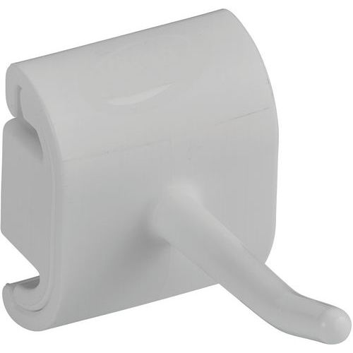 Gancho simples concebido para pendurar ferramentas de limpeza que têm um orifício para fixação na parede. Faça-o deslizar na base/travessa a partir do lado esquerdo ou direito. O módulo de gancho simples tem capacidade para ferramentas até 3 kg. Gancho prático e simples de desmontar, para limpeza ou substituição.
