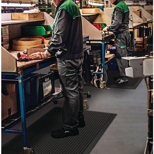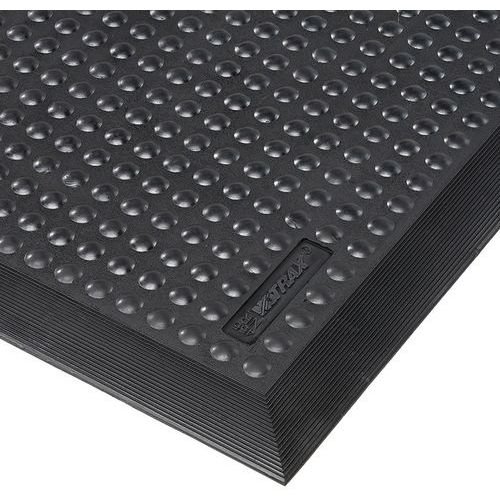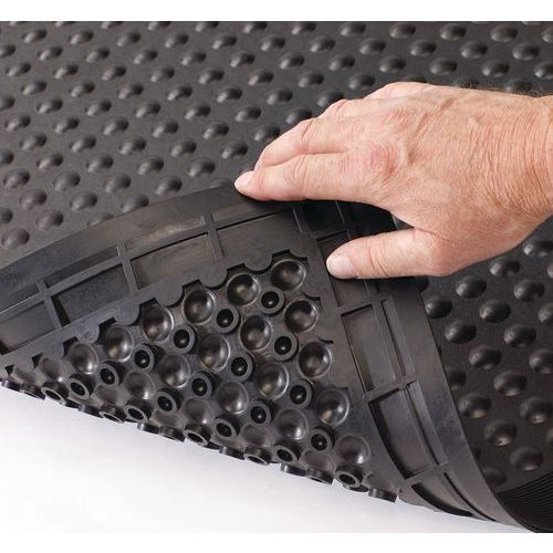 Tapete antifadiga individual em borracha para todas as aplicações gerais. Este tapete foi concebido para aderir ao pavimento de modo a evitar deslizamentos através da captura de ar nos seus alvéolos. As suas bolsas de ar, juntamente com a resistência da borracha, promovem um efeito de almofada ao mesmo tempo que lhe conferem um peso reduzido. Bordas biseladas integradas em todos os quatro lados para evitar tropeçar no tapete. Tapete individual sem necessidade de instalação específica.