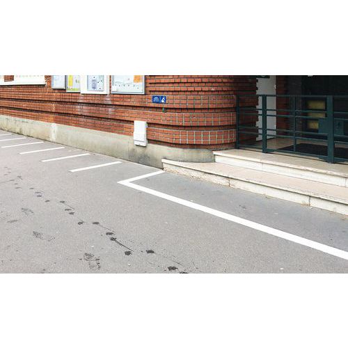 Traçado das linhas preciso no chão de parques, armazéns e zonas de depósito. Traçado entre 75 e 100 m em 50 mm de largura em piso liso. Excelente poder de cobertura. Muito boa resistência à abrasão mecânica e química. Secagem rápida. Tinta de epóxi de marcação sem aditivos à base de chumbo, nem CFC, ou solventes com cloro. Grande durabilidade. Recomendado para a implementação do distanciamento social. Permite o cumprimento da distância mínima de 1 metro.