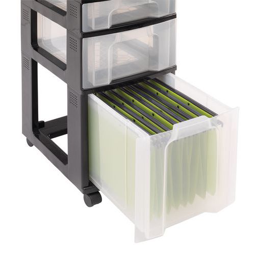 Torre de arrumação montada sobre 4 rodízios para uma maneabilidade máxima. Gavetas transparentes para melhor visibilidade do conteúdo. Herméticas para uma proteção máxima contra a poeira. Contorno com zonas com relevos dos lados para uma etiquetagem fácil.