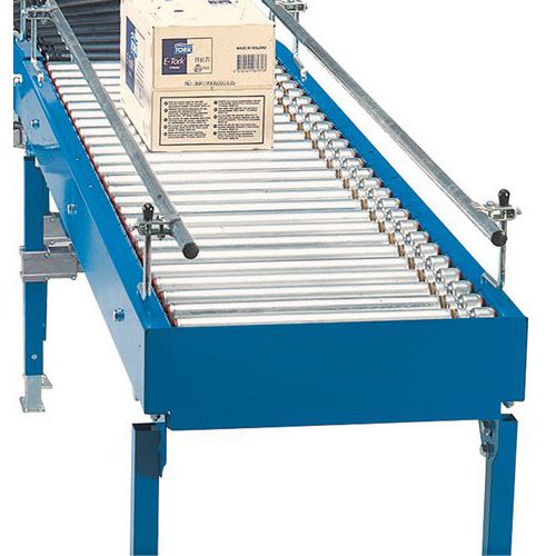 Transportador acumulador motorizado RCLA, comando por correias e rolos com 400 mm de comprimento. Circuito modular com partes retas e curvas. Transportador com quadro robusto. Acabamento tinta epóxi antichoques. Segurança absoluta das cargas.