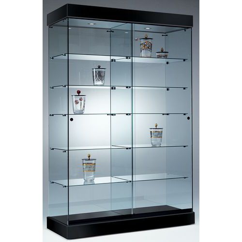 Vitrina fabricada totalmente em vidro com base em preto, branco ou faia.