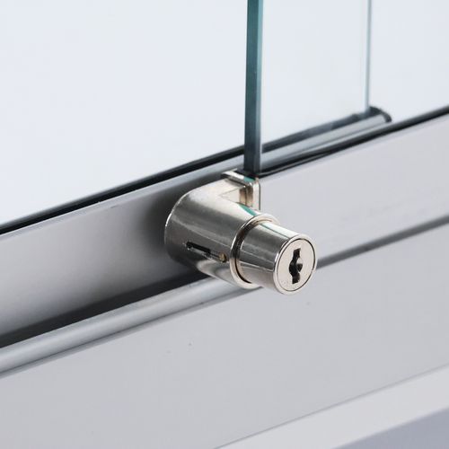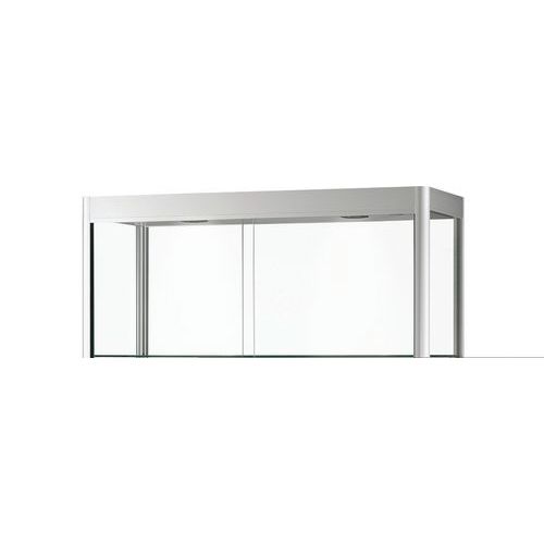 Vitrina com 3 prateleiras reguláveis em vidro flutuante de 6 mm. Porta corrediça em vidro temperado (6 mm) com trinco. Suporta uma carga de 8 kg por prateleira. Com iluminação PowerLED 2 x 7 W (branco quente) na parte superior que funciona com tomada. Armário baixo com 2 portas corrediças bloqueáveis com fechadura de canhão. Parte superior da vitrina oca. Os focos funcionam apenas com tomada. Pés reguláveis com reguladores de nivelamento. Vitrina de exposição entregue montada.