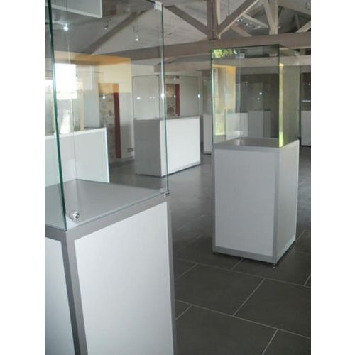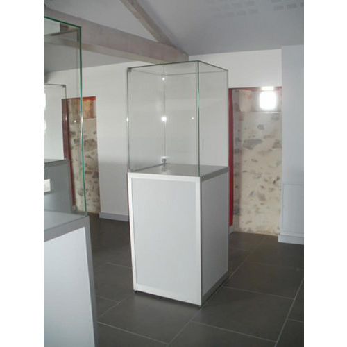 Vitrina de exposição com campânula e base, pronta a ser utilizada. Colagem UV utilizada na campânula de vidro temperado nas extremidades. Porta rebatível em vidro temperado com fecho de segurança. Estrutura da base robusta e resistente com perfil em alumínio anodizado. Com reguladores para nivelação no solo.