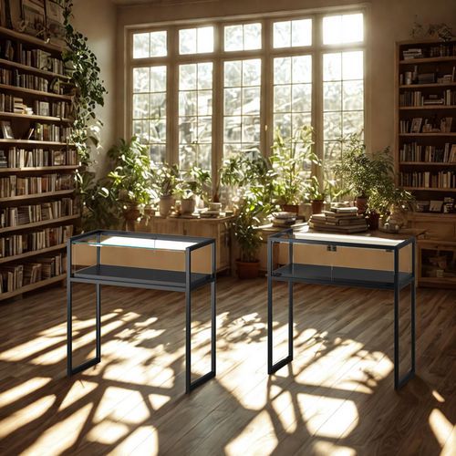 Vitrina de exposição tipo mesa com iluminação, pronta a ser utilizada. Estrutura robusta e resistente. Vidro temperado de elevada qualidade em todas as faces (incluindo parte superior e portas). 2 portas rebatíveis com fechaduras de segurança. Iluminação horizontal com barra LED de 4000°K.