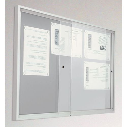 Vitrina de exposição interior com estrutura em alumínio anodizado para a apresentação de mensagens e indicações nos espaços de receção. Portas corrediças em plexiglas de 4 mm, práticas para a fixação em corredores ou passagens estreitas. Fundo magnético cinzento para fixar os documentos com relevos magnéticos.