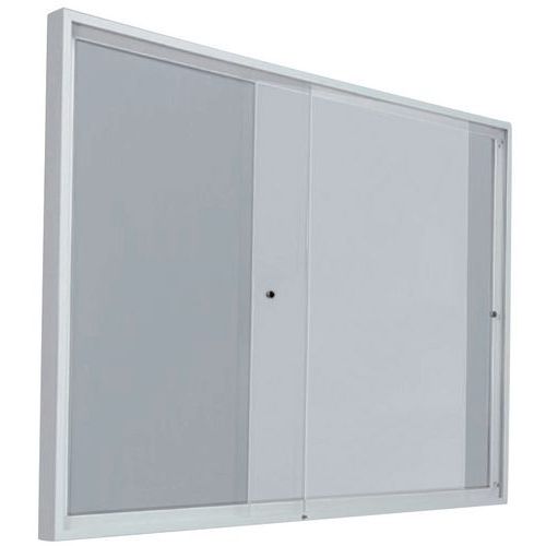 Vitrina de exposição interior com estrutura em alumínio anodizado para a apresentação de mensagens e indicações nos espaços de receção. Portas corrediças em plexiglas de 4 mm, práticas para a fixação em corredores ou passagens estreitas. Fundo magnético cinzento para fixar os documentos com relevos magnéticos.