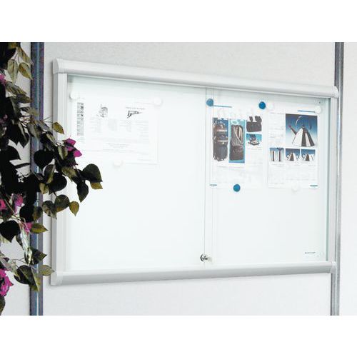 Vitrina de exposição interior com estrutura em alumínio anodizado e portas corrediças bloqueáveis através da fechadura frontal. Fundo em chapa lacada, permitindo uma escrita apagável a seco e a fixação de documentos com relevos magnéticos. Porta em vidro Securit transparente de 4 mm que proporciona uma elevada resistência a impactos e a choques térmicos. A vantagem do vidro Securit é que, em caso de quebra, este fragmenta-se em pedaços pequenos para evitar acidentes.