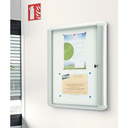 Vitrina de exposição interior com quadro em alumínio anodizado para um aspeto moderno e elegante. Exponha as informações em total segurança graças à porta em vidro Securit. O fundo em metal magnético prático permite fixar com ímanes. Porta rebatível prática e bloqueável para uma segurança máxima.