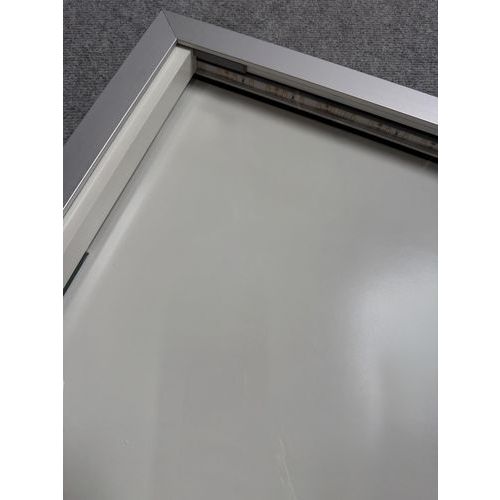 Vitrina interior e exterior com porta rebatível, estrutura prateada e iluminação LED. Vitrina exterior com iluminação alta, fundo branco totalmente estanque e resistente às intempéries. Vitrina interior e exterior magnética que permite a afixação através de ímanes. Com bloqueio para proteger o seu conteúdo exposto. Com porta em vidro temperado para elevada resistência.